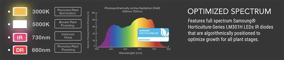 - Specially formulated with full-spectrum Samsung LM301H white, red, and IR LEDs optimized for all grow stages.