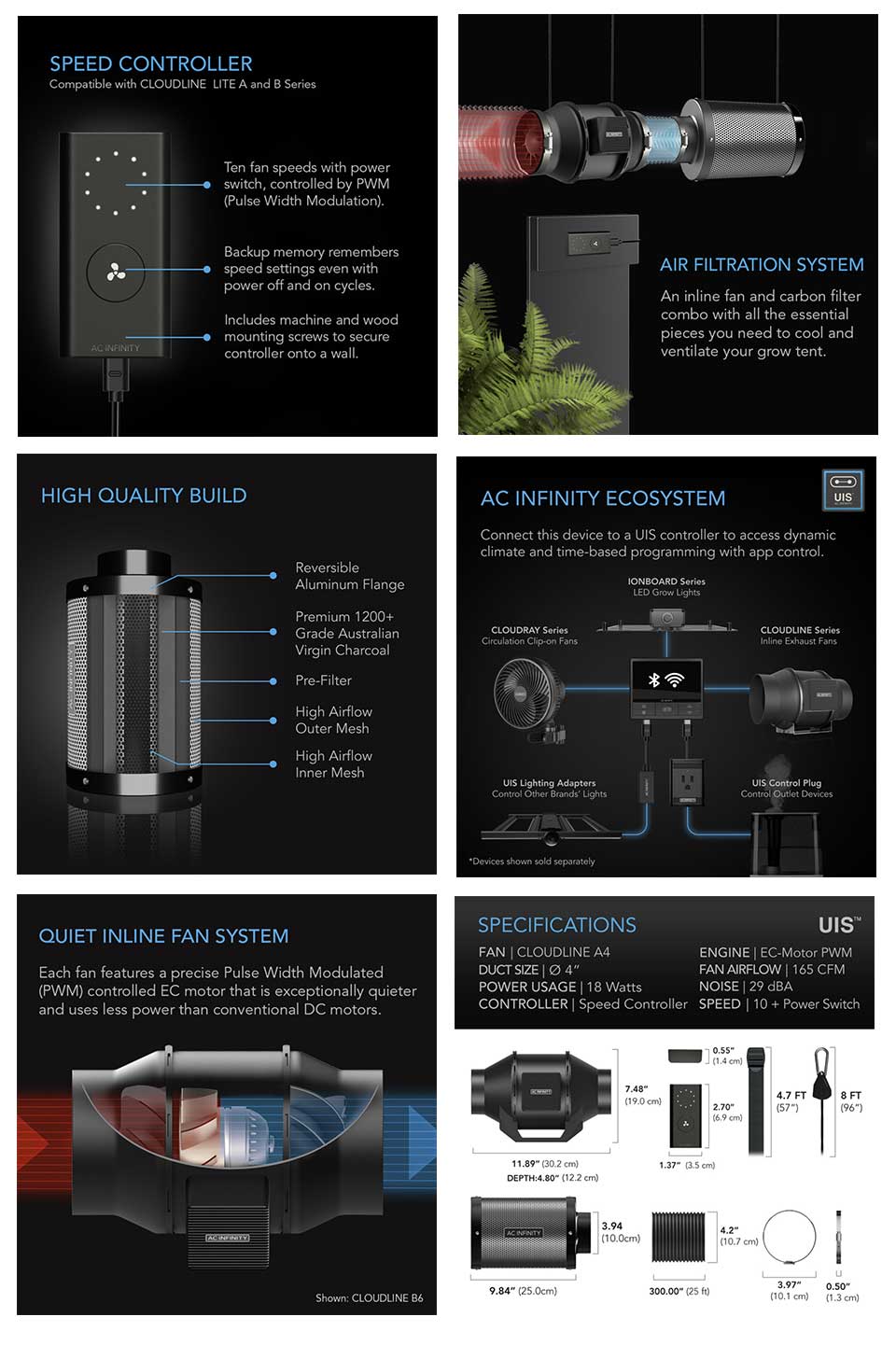 The AC Infinityproduct line includes a complete range of Fan and Filter Combo Kits, Inline Fan Systems, Carbon Filters, Duct Fan Silencers, Ducting & Clamps.